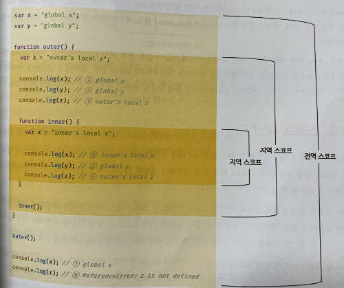 상위 스코프에서 유효한 변수는 하위 스코프에서 자유롭게 참조할 수 있지만 하위 스코프에서 유효한 변수를 상위 스코프에서 참조할 수없다.
