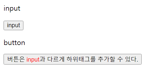 <button>버튼은 <span style="color: red;">input</span>과 다르게 하위태그를 추가할 수 있다.</button>