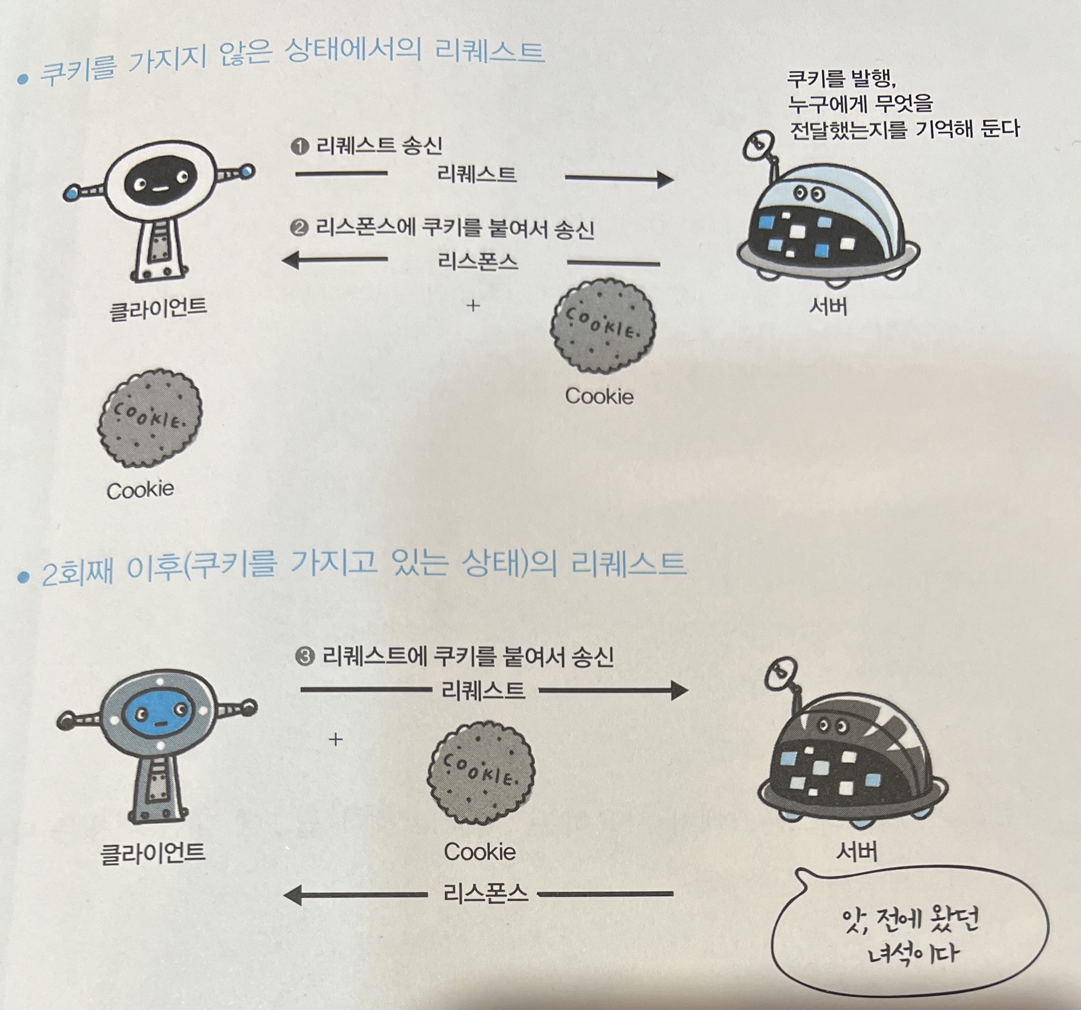 쿠키는 리퀘스트와 리스폰스에 쿠키 정보를 추가해서 클라이언트의 상태를 파악하기 위한 시스템이다.